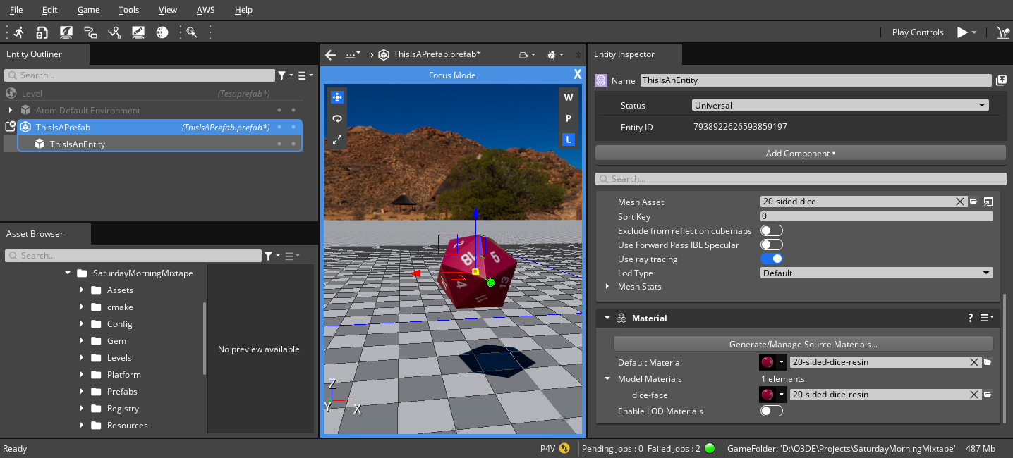To create an entity with an asset as its basis, drag an asset such as a .azmodel or a .actor from Asset Browser into Entity Outliner or the viewport. In the following video, a .azmodel is dragged into the viewport from Asset Browser, and a new entity with a Mesh component is created in the level.