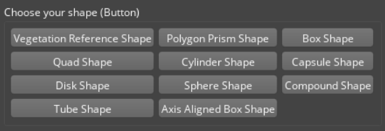shape_service = math.Crc32_CreateCrc32("ShapeService") provided_services = [shape_service.value] type_ids = editor.EditorComponentAPIBus(bus.Broadcast, 'FindComponentTypeIdsByService', provided_services, [])Query the names of the Shape components. Later, you will add these name to the buttons.