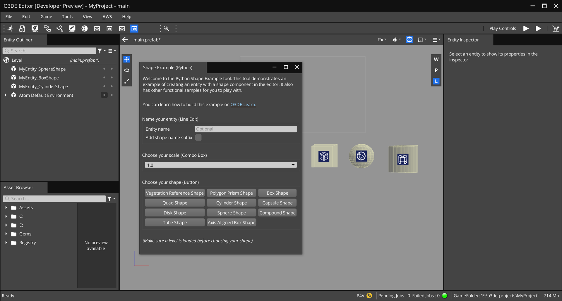 In this tutorial, you’ll learn how to extend the Open 3D Engine (O3DE) Editor using the PythonToolGem template to create a custom tool Gem called MyPyShapeExample. This custom tool allows you to create entities with a Shape component and configure their component properties. The Gem is written in Python with