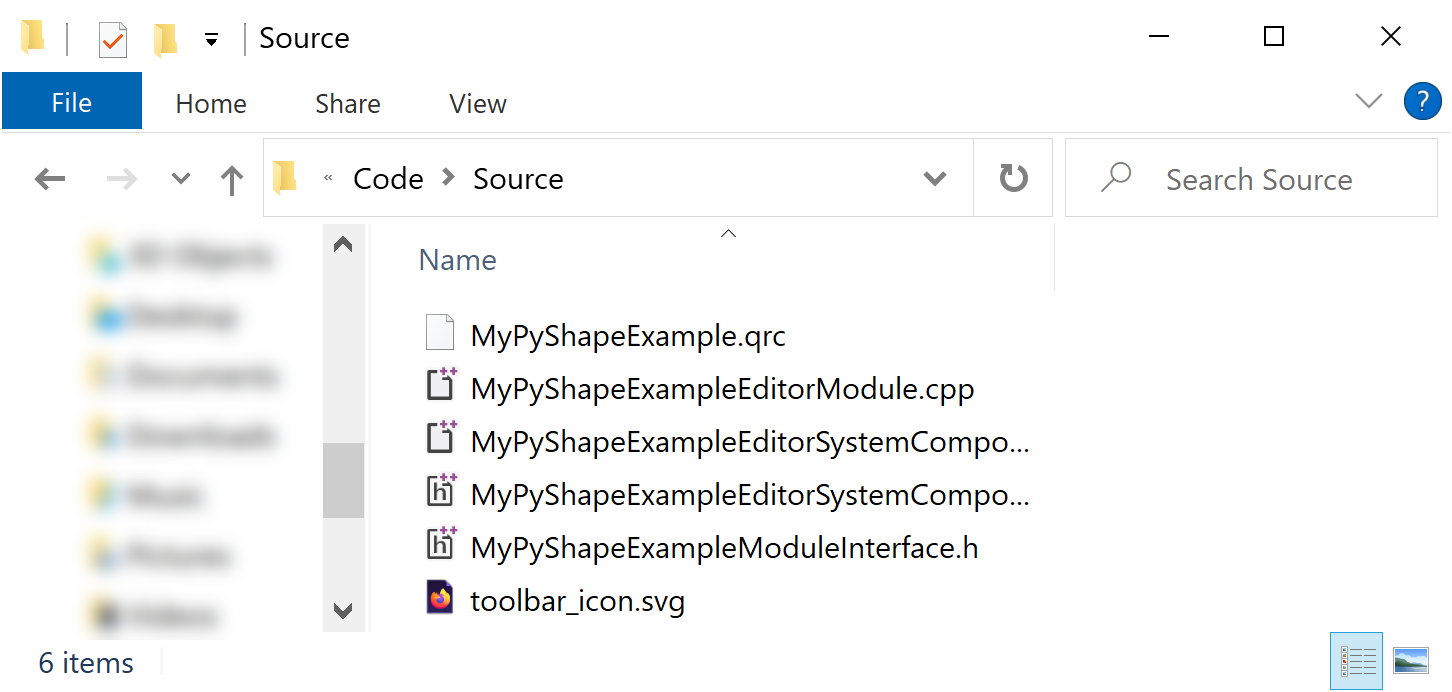 Code\Source\ShapeExample.qrcwith your new icon’s file name.<!DOCTYPE RCC><RCC version="1.0"> <qresource prefix="/MyPyShapeExample"> <file alias="toolbar_icon.svg">toolbar_icon.svg</file> </qresource> </RCC>Register MyPyShapeExample Gem’s resources to Qt Resource System by adding the following code in