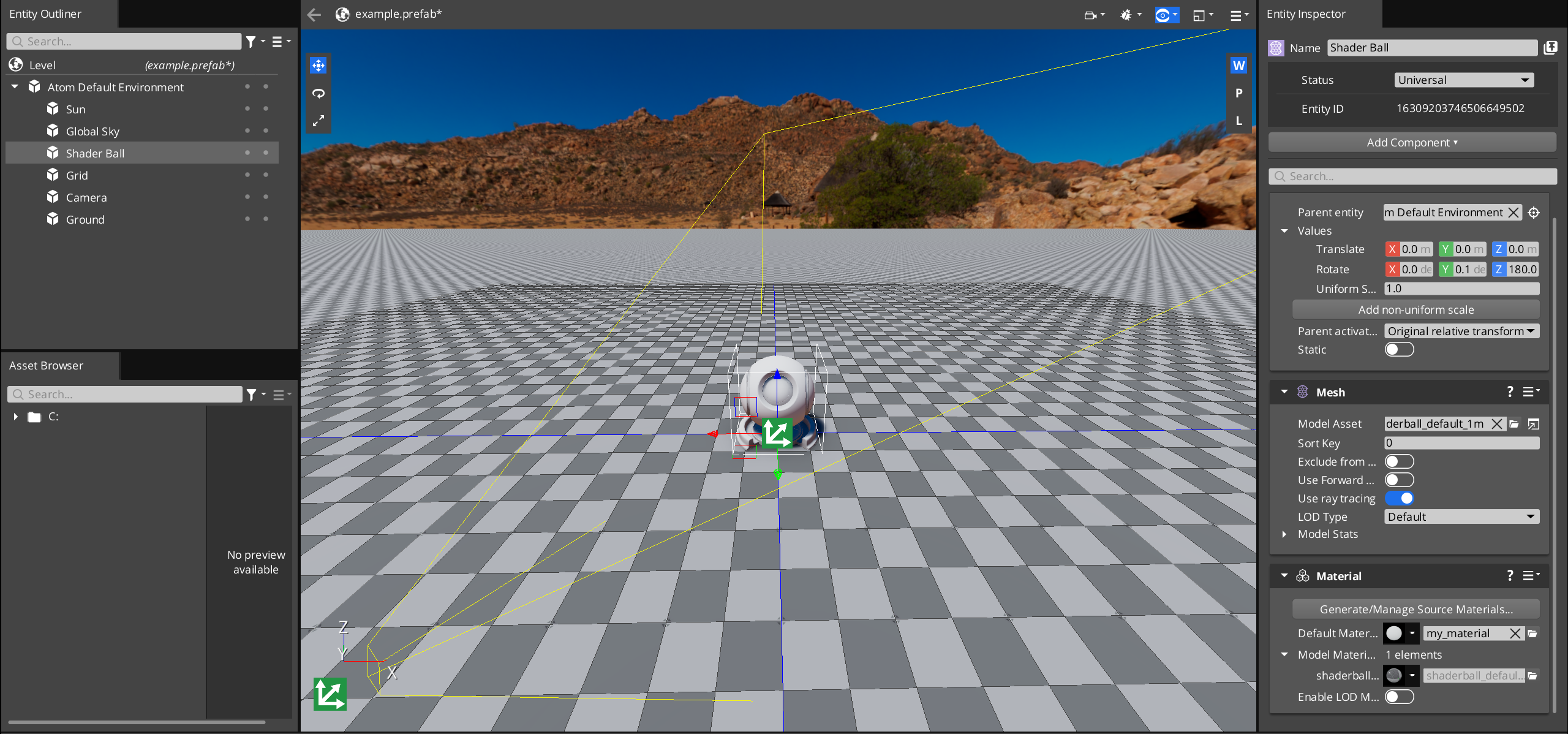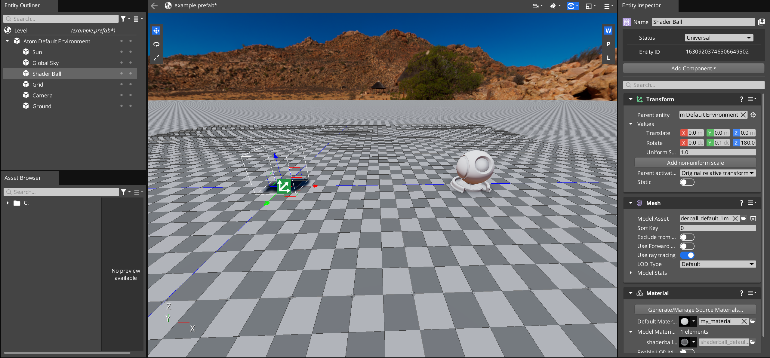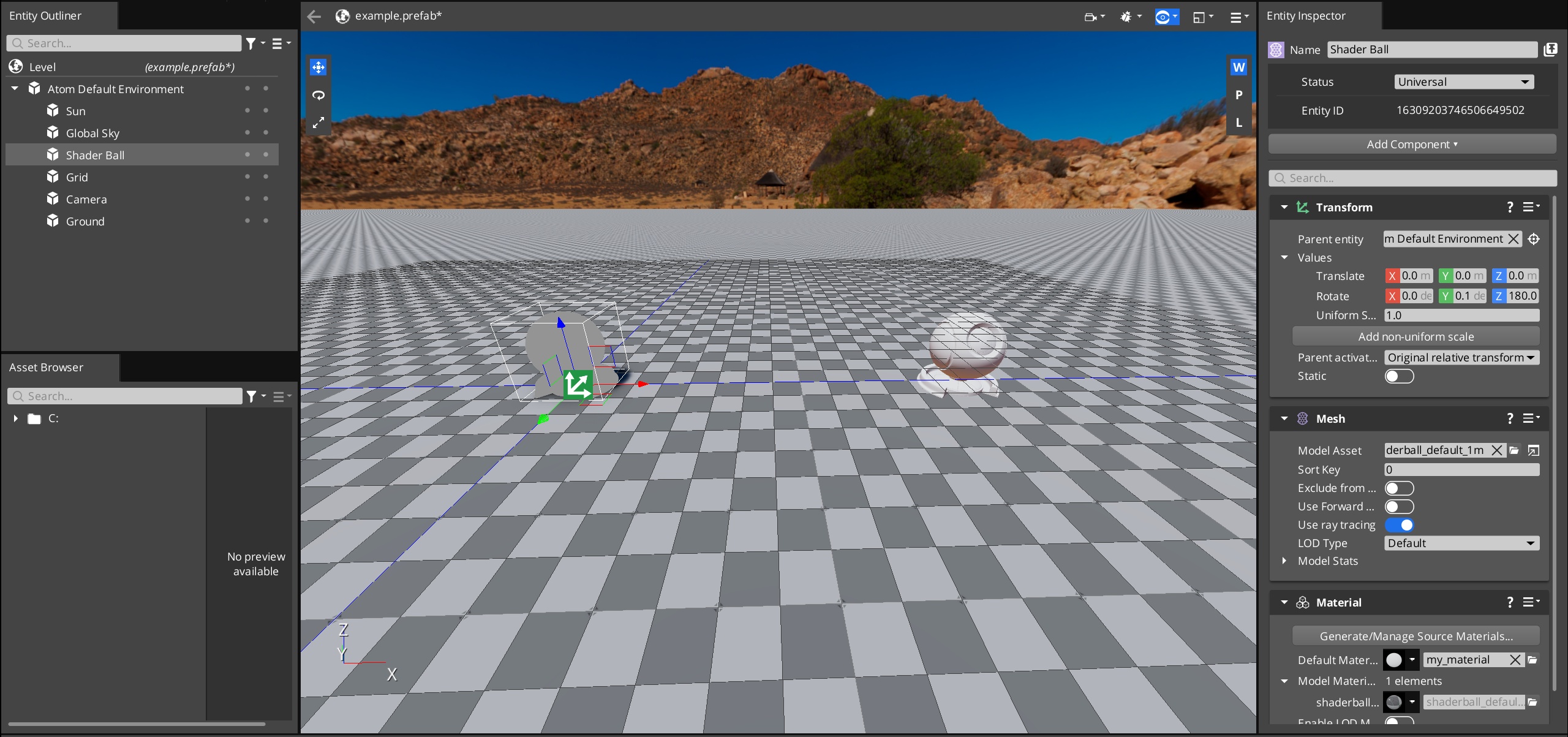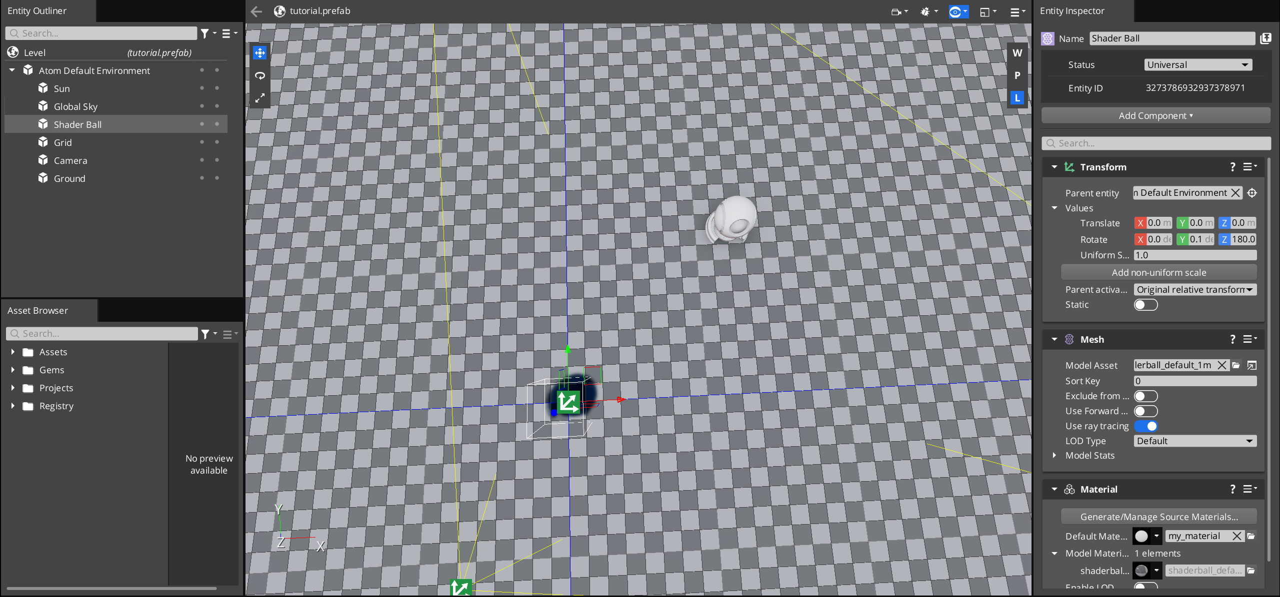 Back in the Editor, select the shader ball that is already included in the default level. The Entity Inspector should now show the properties of the shader ball object.