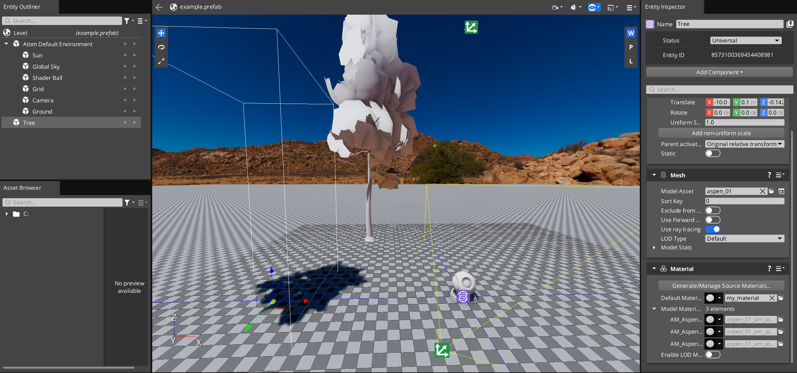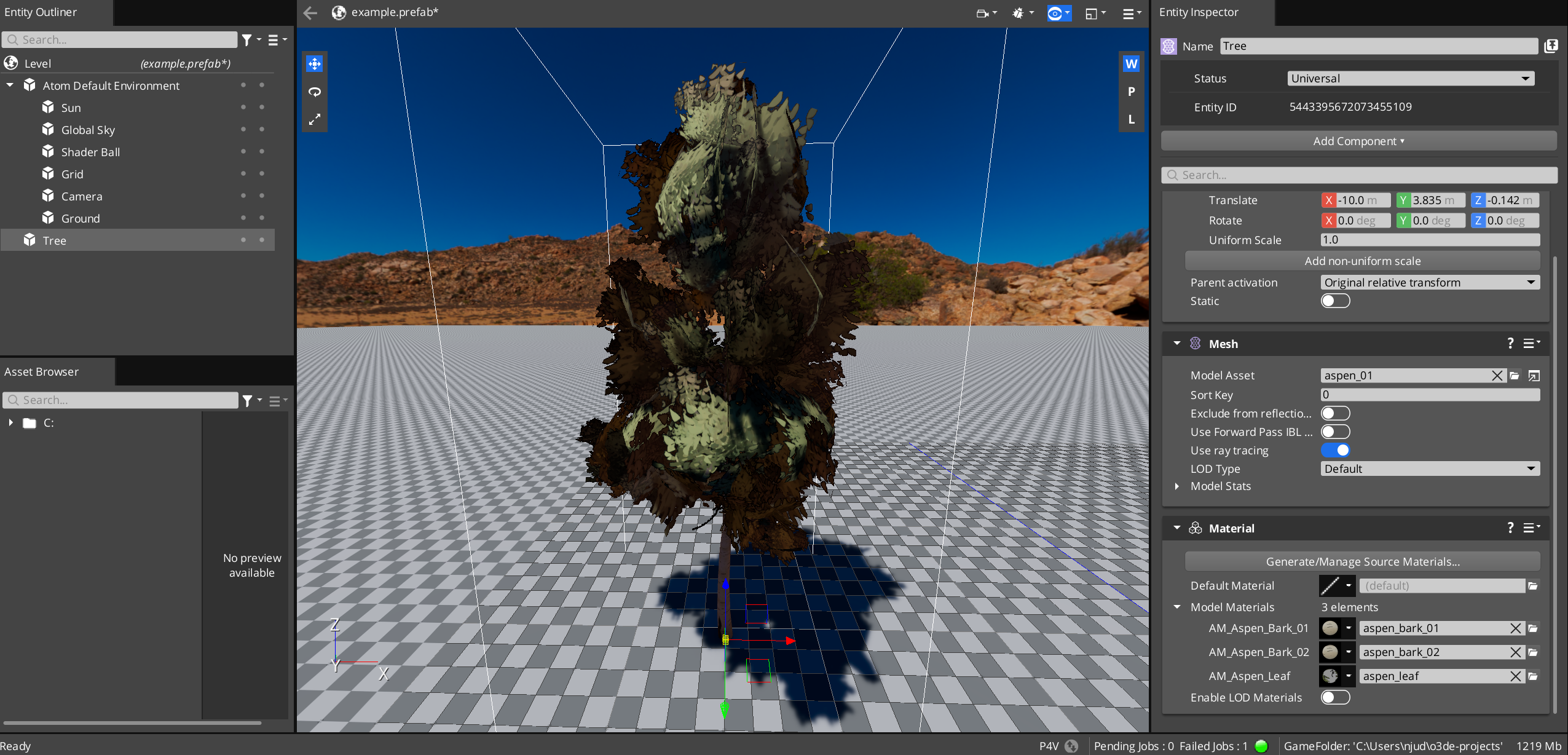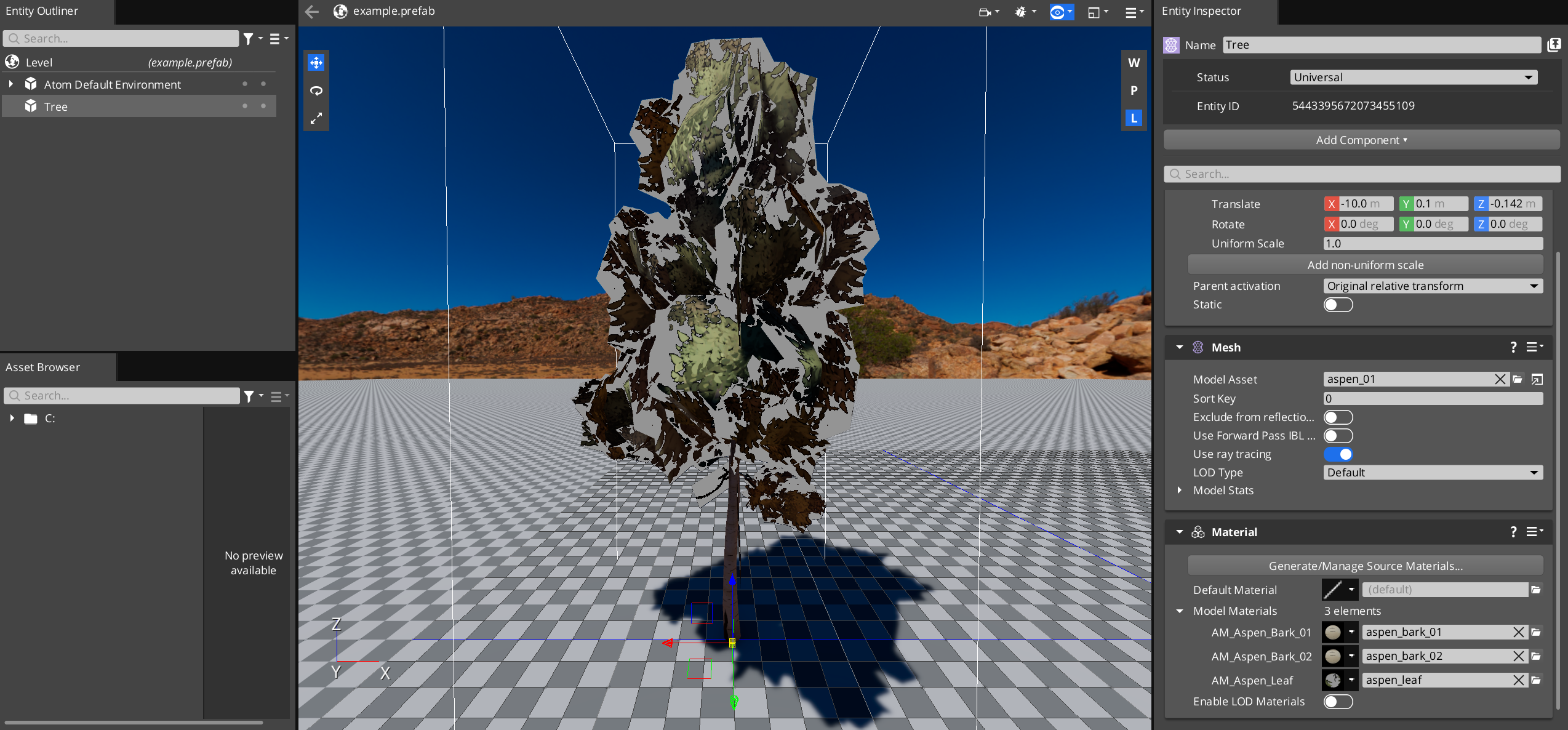 tree.fbxmodel to the entity. In the Mesh component, for the Model Asset property, search for and selecttree.fbx.Still in the Mesh component, click Add Material Component.