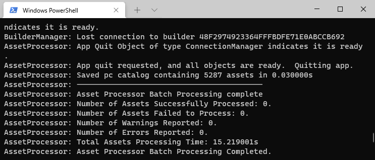MyProject.Assetstarget.cmake --build build\windows --target MyProject.Assets --config profile -- -mFirst, this command builds the Asset Processor tools. Then, it runs Asset Processor Batch and processes the assets. You don’t need to rerun Asset Processor or Asset Processor Batch unless you make changes in your project.