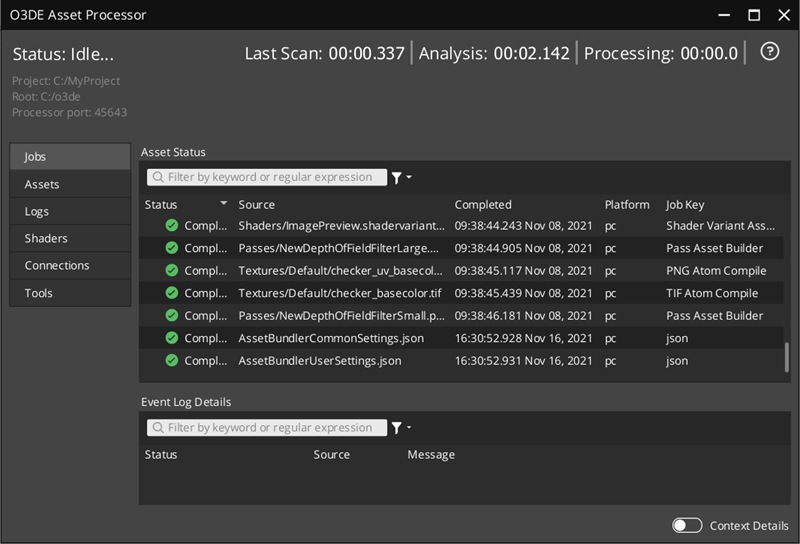 Verify that Asset Processor successfully processed your assets by checking their status. Asset Processor can process your assets with or without warning or error, or they can fail to process. Warnings and errors indicate that your asset may need your attention, but they don’t impede the ability to create a project game release layout. On the other hand, it’s critical that you resolve any assets that were not processed due to failure.