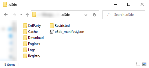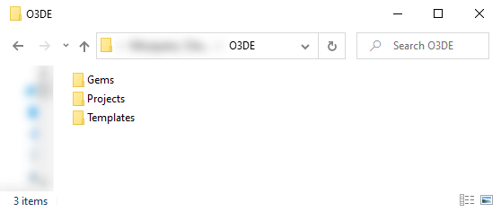 The O3DE directory is located in the user’s home directory. It contains the default locations for user-created Gems, projects, and templates.